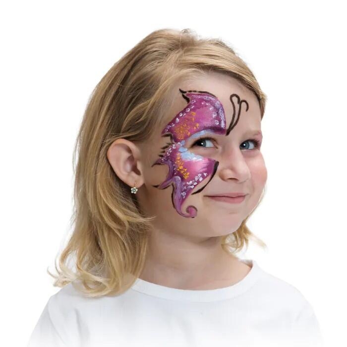 Ansigtsmalingen er vandbaseret, nem at arbejde med og let at vaske af igen (hurra for glade forældre). Der medfølger både påføringssvamp og en lille pensel, så du er klar til at male med det samme – ingen ekstra udstyr nødvendigt.