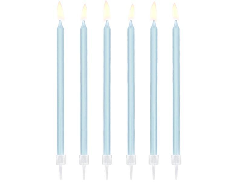 Den bløde lyseblå nuance passer perfekt til baby shower, dåb, fødselsdag eller fest med blå tema. De lange lys brænder flot og roligt, og de medfølgende 12 hvide plast-lysholdere sikrer, at lysene står stabilt og sikkert i kagen.