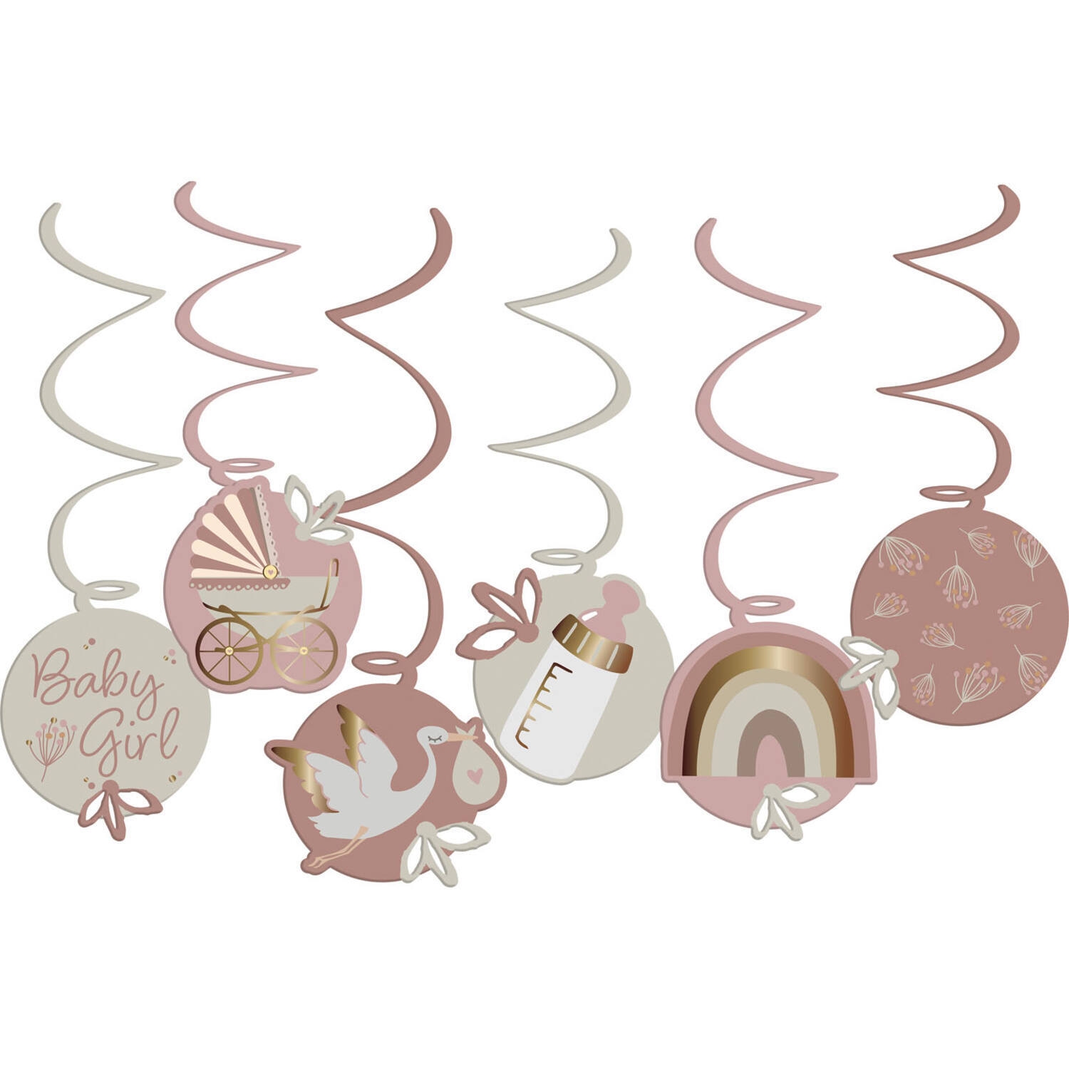 Skab den fineste og mest romantiske stemning til babyshower, barnedåb eller navngivningsfest med disse hængende swirls i bløde creme- og gammelrosa nuancer med fine baby Girl motiver.