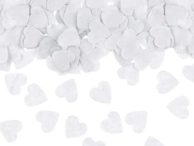 1 pk. hjertekonfetti med hvide hjerter i silkepapir. Hjerterne måler 1,6x1,6cm og pakken indeholder 15g.