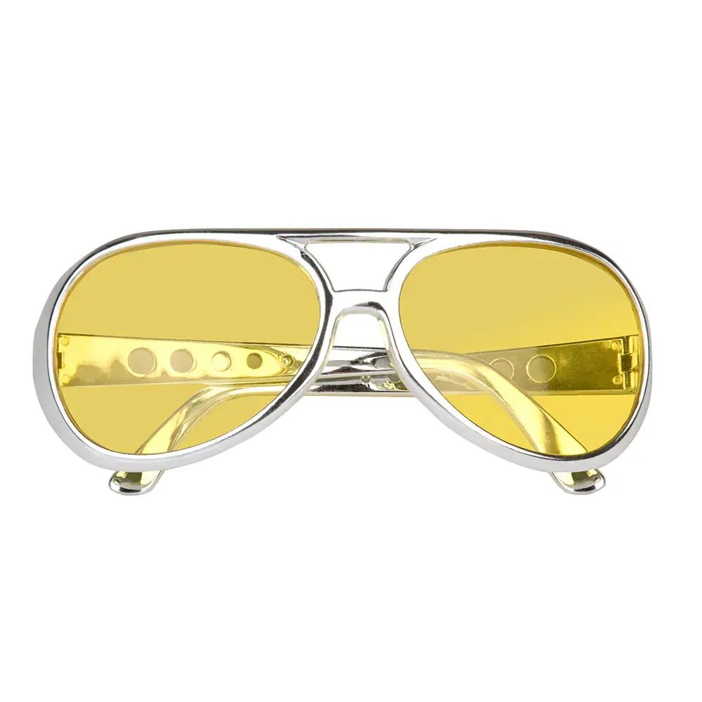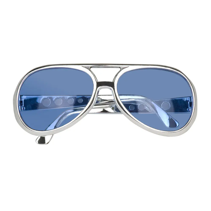 Træd ind i rampelyset med disse legendariske Elvis-inspirerede solbriller, der emmer af 50'er-glamour og rock'n'roll attitude. Brillerne har et klassisk sølvfarvet stel og fås med farvet glas i blå, lyserød, gul eller rød – perfekt til at fuldende dit retrolook.