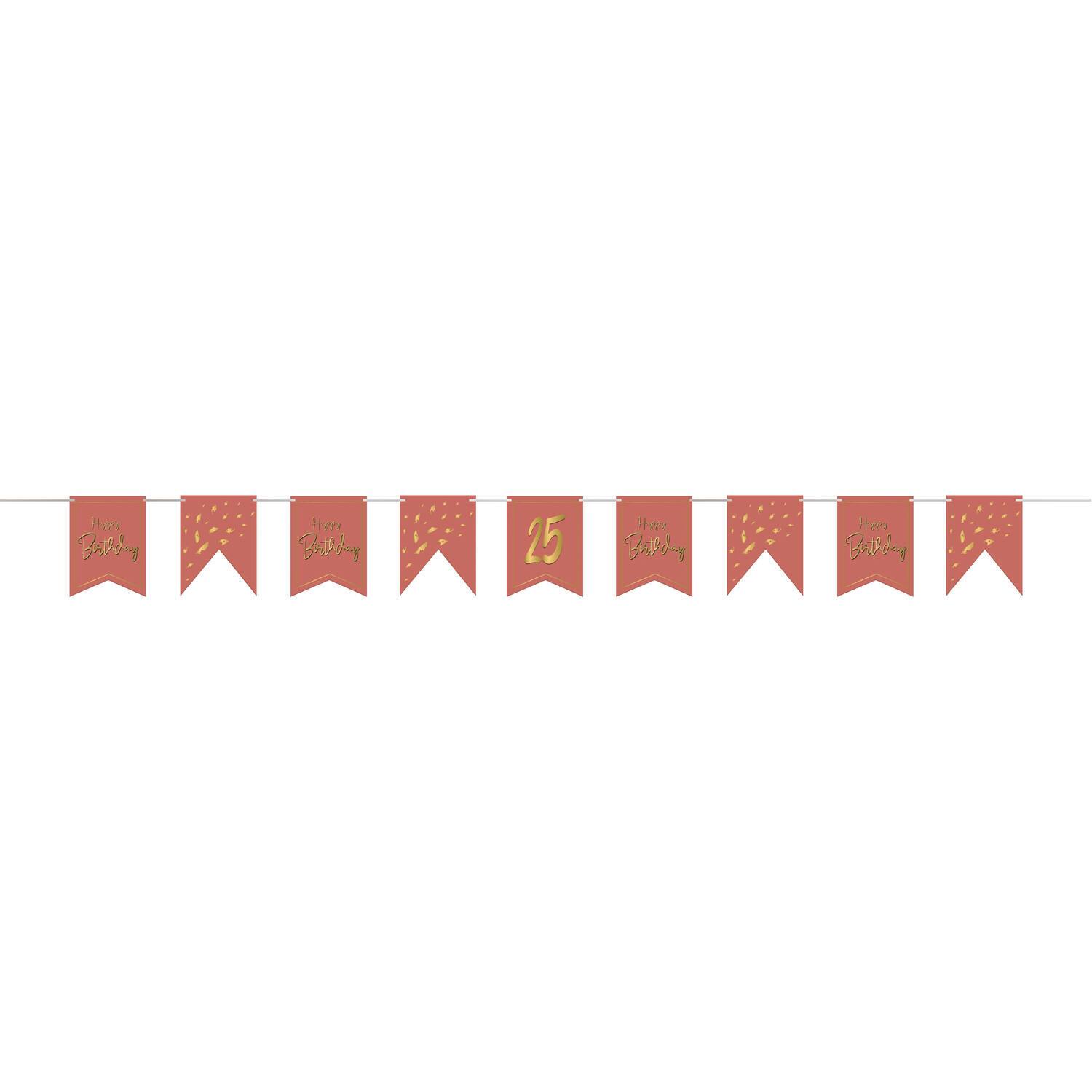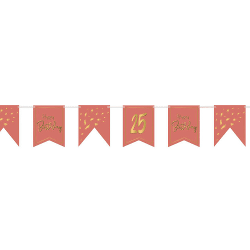 Fødselsdags flagguirlande i støvet rød DYI. Indeholder 1 flagbanner der måler 4 meter lang og 3 x guld stickers med numrene fra 0-9 så man selv kan påsætte tallet for fejringen.