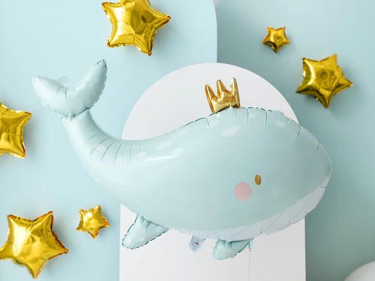 Sig hej til festens sødeste havven – en stor hval folieballon med guld krone, der måler hele 78x50 cm! Den nuttede hval med sit glade smil og skinnende krone spreder glæde og eventyrstemning til babyshowers, fødselsdage, dåb eller havtema-fester.