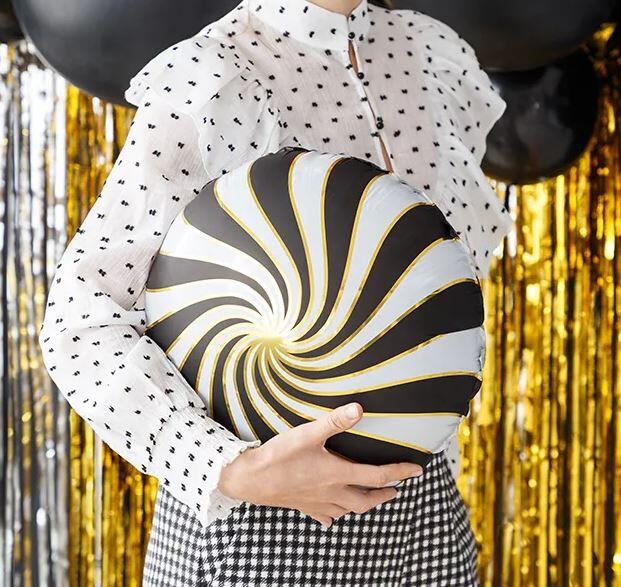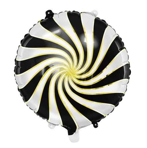 Sort- og hvidstribet bolsje folieballon – 35 cm med gulddetaljer