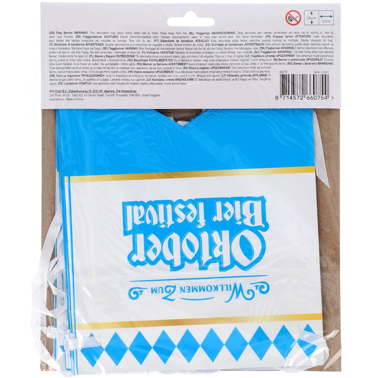 Oktober Bier festival flag guirlande, 10 meter hvid satinsnor og 15 plastflag i hvid og lyseblå som hver måler 15x20cm.