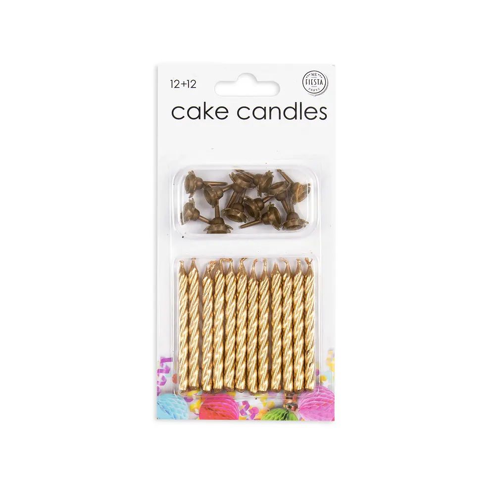 Pakken indeholder 12 stk små traditionelle kagelys i guld med tilhørende kagespyd.