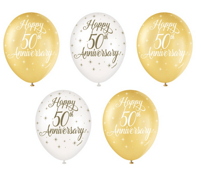 Pakken indeholder 5 stk flotte gummi balloner i 2 farver med smuk tekst: happy 50`th anniversary.