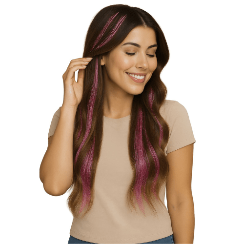 Vil du skrue op for glitterfaktoren med et feminint og festligt twist, så er disse hårextensions i glitter-lyserød lige i øjet! Du får 3 stk. meget lange extensions, monteret på smarte små hårkamme, så de nemt klikkes i håret, når festen kalder. Hver extension måler 50 cm, hvilket giver masser af længde, bevægelse og glitrende wow-effekt – perfekt til fest, temafest, polterabend eller bare når håret skal have lidt ekstra kærlighed ✨