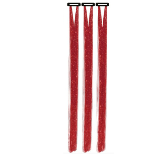3 stk hårextensions i glitter-rød på sorte hårkamme. De røde glitter extensions måler hver ca.50cm i længden.