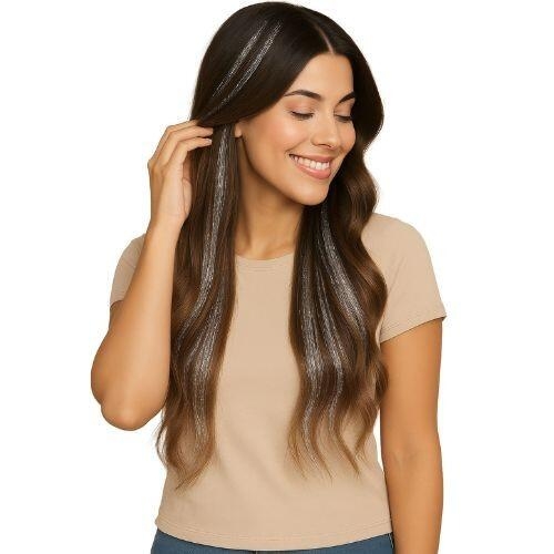 Gå all-in på glamour med disse sølvfarvede glitter extensions, der fanger lyset bedre end en diskokugle. Du får 3 stk. ekstra lange extensions på små hårkamme, hver på 50 cm, som giver et elegant, festligt og super cool look. Perfekte til nytår, temafest, show, festival – eller når håret bare skal skinne lidt ekstra ✨