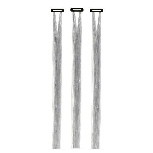3 stk. lange hår extensions i flot glitter-sølv farve. Extensions måler hver ca. 50cm i længden og sidder på en lille sort hårkam.