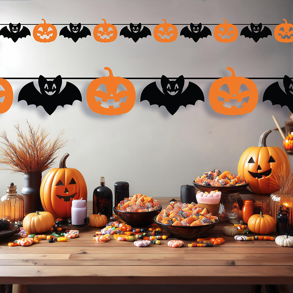 Skru op for stemningen med denne Halloween guirlande med græskar og flagermus! Den perfekte dekoration til enhver Halloweenfest – hvad enten det er derhjemme, i klasseværelset, på kontoret eller i butikken. De orange græskar og sorte flagermus i skiftende mønster skaber et legende og (u)hyggeligt udtryk, der passer til både børn og voksne. Guirlanden er let at hænge op over døre, vinduer, vægge eller langs et bord, og den kan bruges igen og igen. Fremstillet i letvægtsmateriale, der både er dekorativt og nemt at arbejde med. Et enkelt og effektfuldt pyntetip til dig, der vil skabe et gennemført Halloweenunivers med masser af charme – og et lille gys.