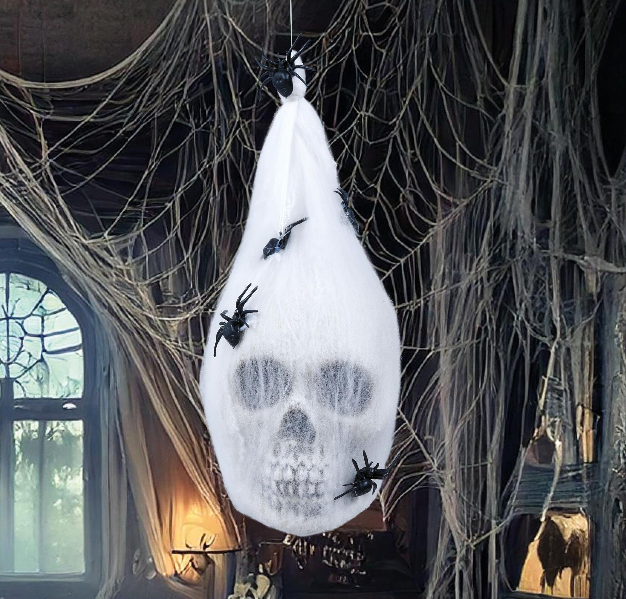 Edderkoppespind puppe med kranie 25cm til ophæng.