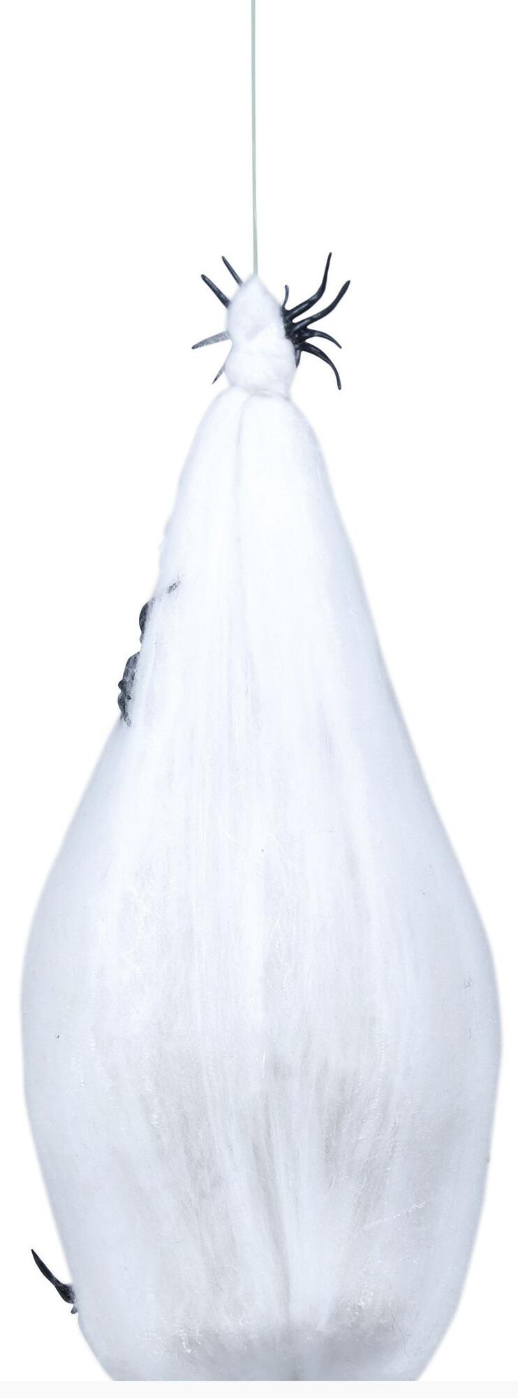 Skab en ekstra uhyggelig stemning til Halloween med denne edderkoppespind-puppe. Puppen måler 25 cm og indeholder et kranie, der er filtret ind i spindelvæv med sorte edderkopper kravlende rundt. Perfekt at hænge op i hjørner, ved indgangen eller som del af en horror-dekoration, hvor den med garanti vil give gæsterne kuldegysninger.