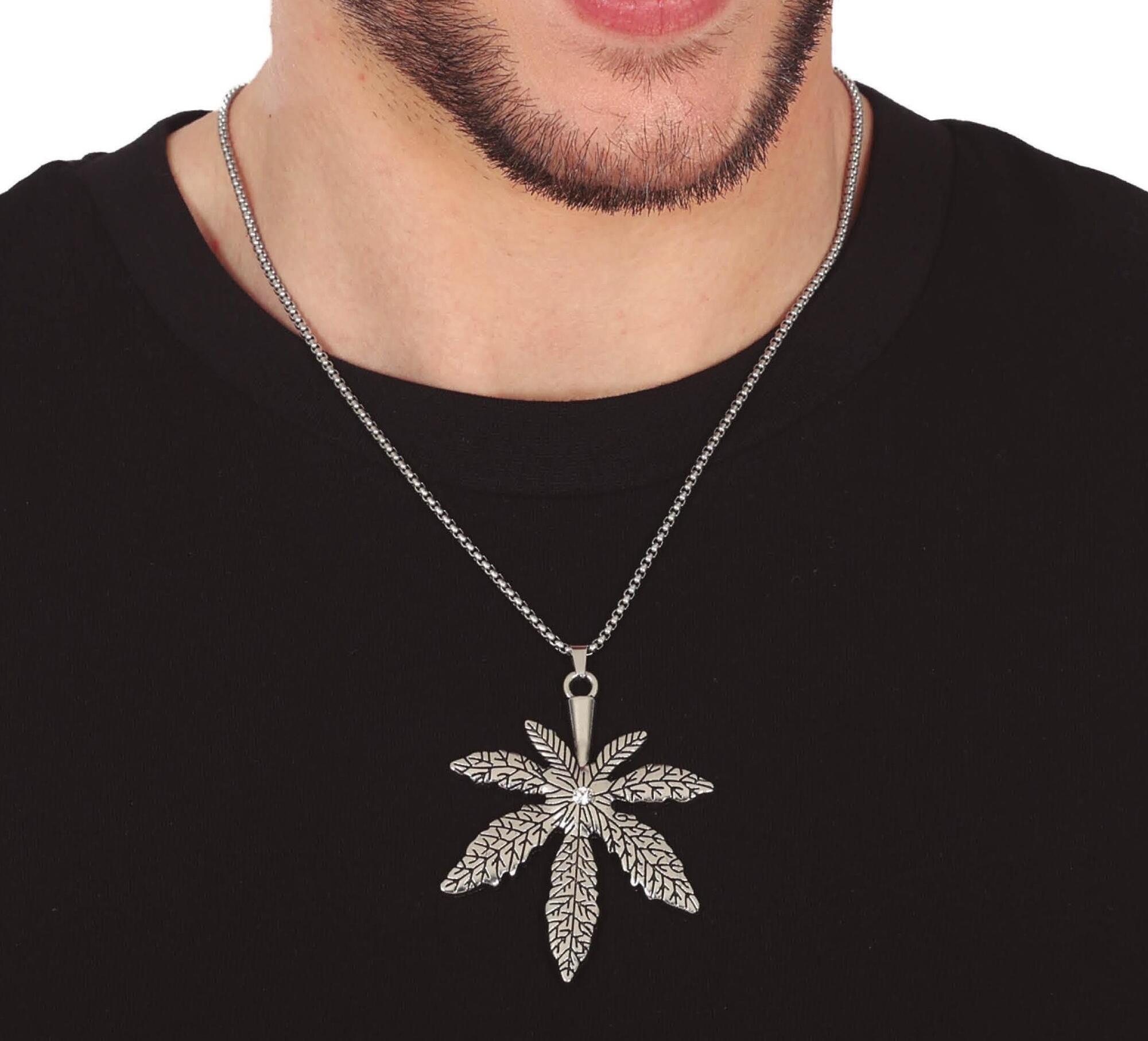 Hamp-blad halskæde. Halskæde i sølvfarvet metal med karabinlås og stort hampblad som vedhæng. Hampbladet måler 6x6cm og har en lille similisten i midten.
