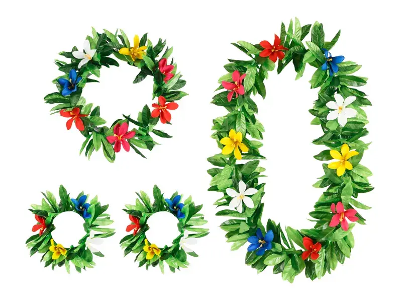 Hawaii-sættet består af én halskrans, én hovedkrans og to håndledskranse. Kransene er lavet med flotte, fyldige grønne blade og pyntet med enkelte kulørte blomster, som giver et naturligt og tropisk udtryk..
