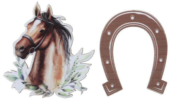 10 stk Heste konfetti i træ, bestående af 5 hestesko måler 3,5x4 og 5 hestehoveder som måler 4x5cm