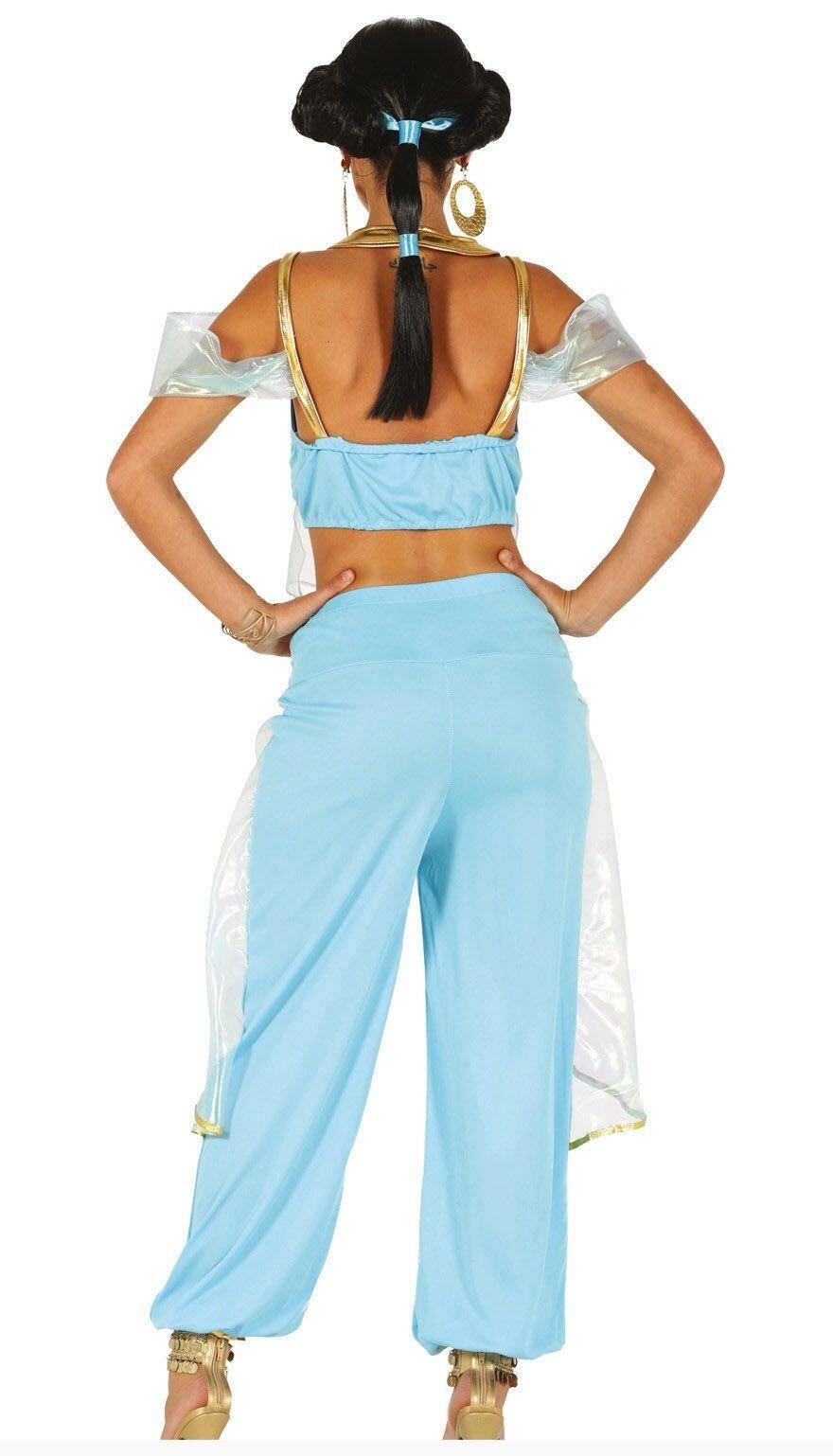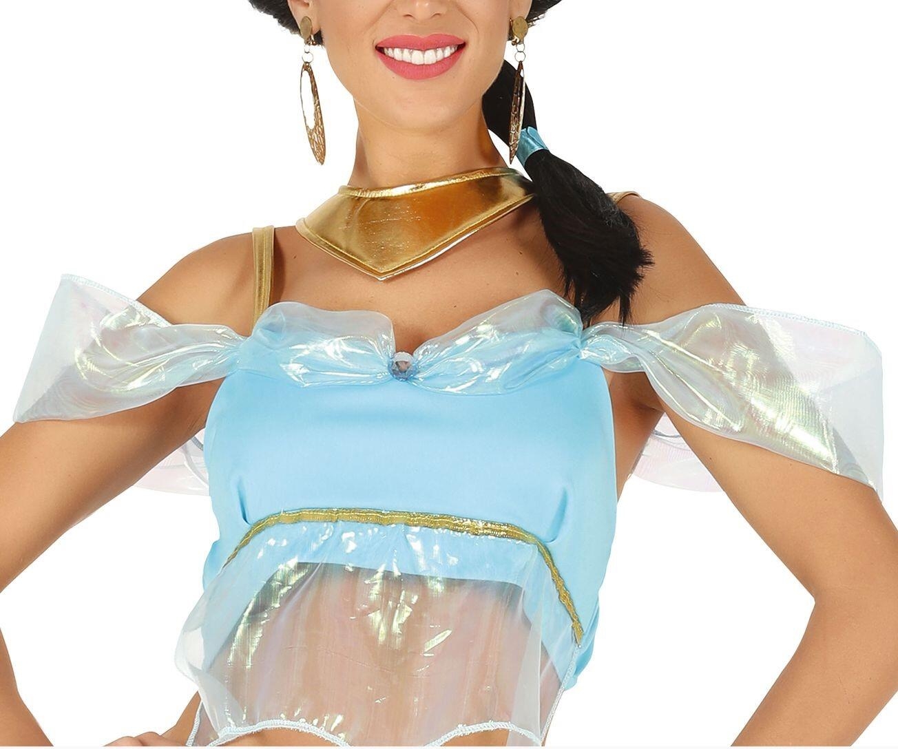 Træd ind i eventyrets verden med dette Ørkenprinsesse kostume – Jasmin, perfekt til fastelavn, karneval eller temafest. Kostumet udstråler eksotisk elegance og farverig charme med et flot sæt bestående af pludder-buks i lyseblå med gennemsigtig tyl, en kort lyseblå top med tyl-ærmer og guldfarvede stropper over skuldrene.