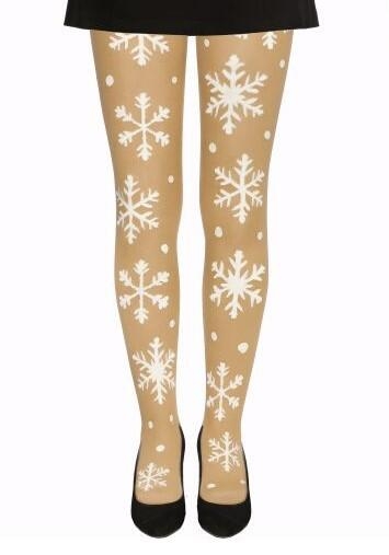 Strømpebukser til voksne i nudefarvet nylon med store hvide snefnug på forsiden.