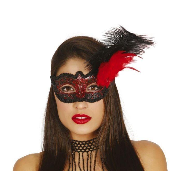 Øjenmaske med rød glitter og fjer. Fin øjenmaske i formstøbt sort plast med front i sort-sølv, fin sort blondekant , rød glitter og fjer i sort-rød. Øjenmasken har sorte bindebånd til nakken.