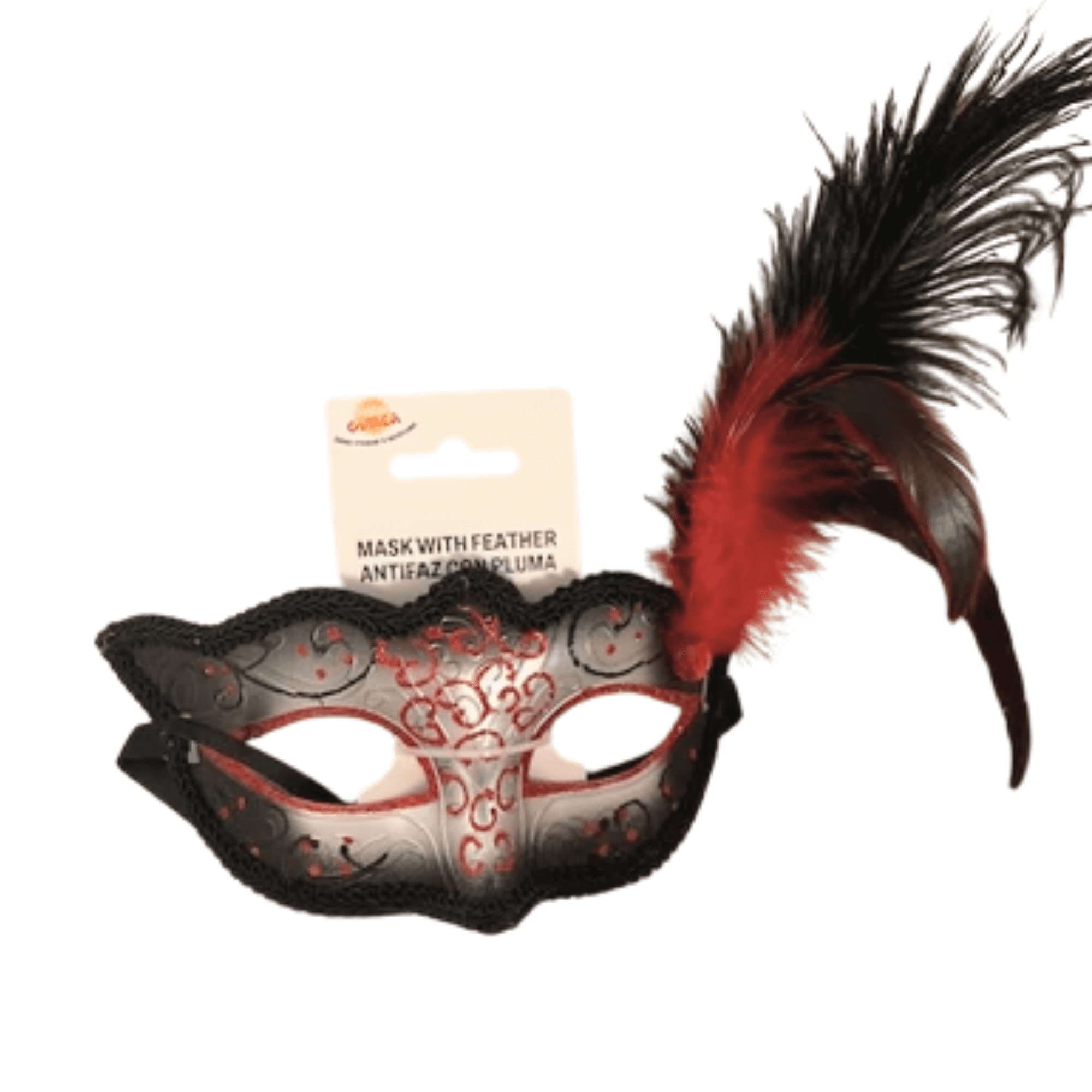 Masken er lavet i formstøbt sort plast, som giver en flot pasform, mens fronten er dekoreret i sølvfarvede detaljer, en fin sort blondekant, glitrende rød glitter og elegante sort-røde fjer. Kombinationen giver masken et dramatisk og luksuriøst udtryk, der straks fanger opmærksomheden.