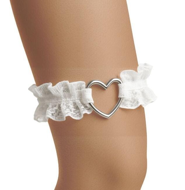Strømpebånd til bryllup. Hvidt strømpebånd med bred elastikblonde foran med stort sølv-hjerte og justerbar elastik på bagsiden, strømpebåndets hjerte måler 4x4,5cm.