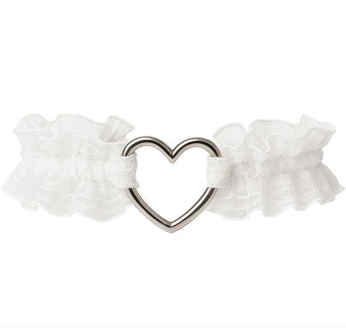 Det fine sølvhjerte giver et diskret, men eksklusivt touch og gør strømpebåndet til en romantisk detalje, der fuldender brudelooket.