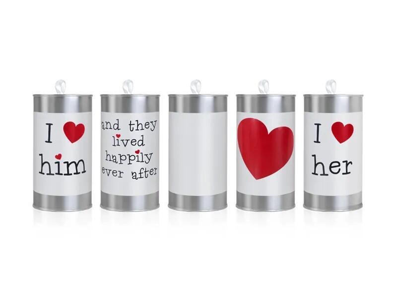Sættet består af 5 hvide metaldåser dekoreret med romantiske hjerter og tekst. De hænger i hvid snor, så de er lige til at binde fast bag bilen. Den midterste dåse har et blankt papirfelt, hvor I selv kan skrive navne, dato eller en sød hilsen – perfekt til at sætte et personligt præg på den store dag.