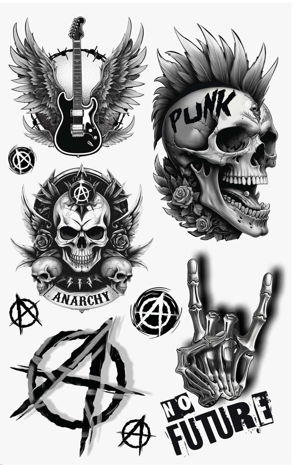 Disse midlertidige punk tatoveringer i sort-hvid giver dig det ægte rebel-look – helt uden blæk under huden.